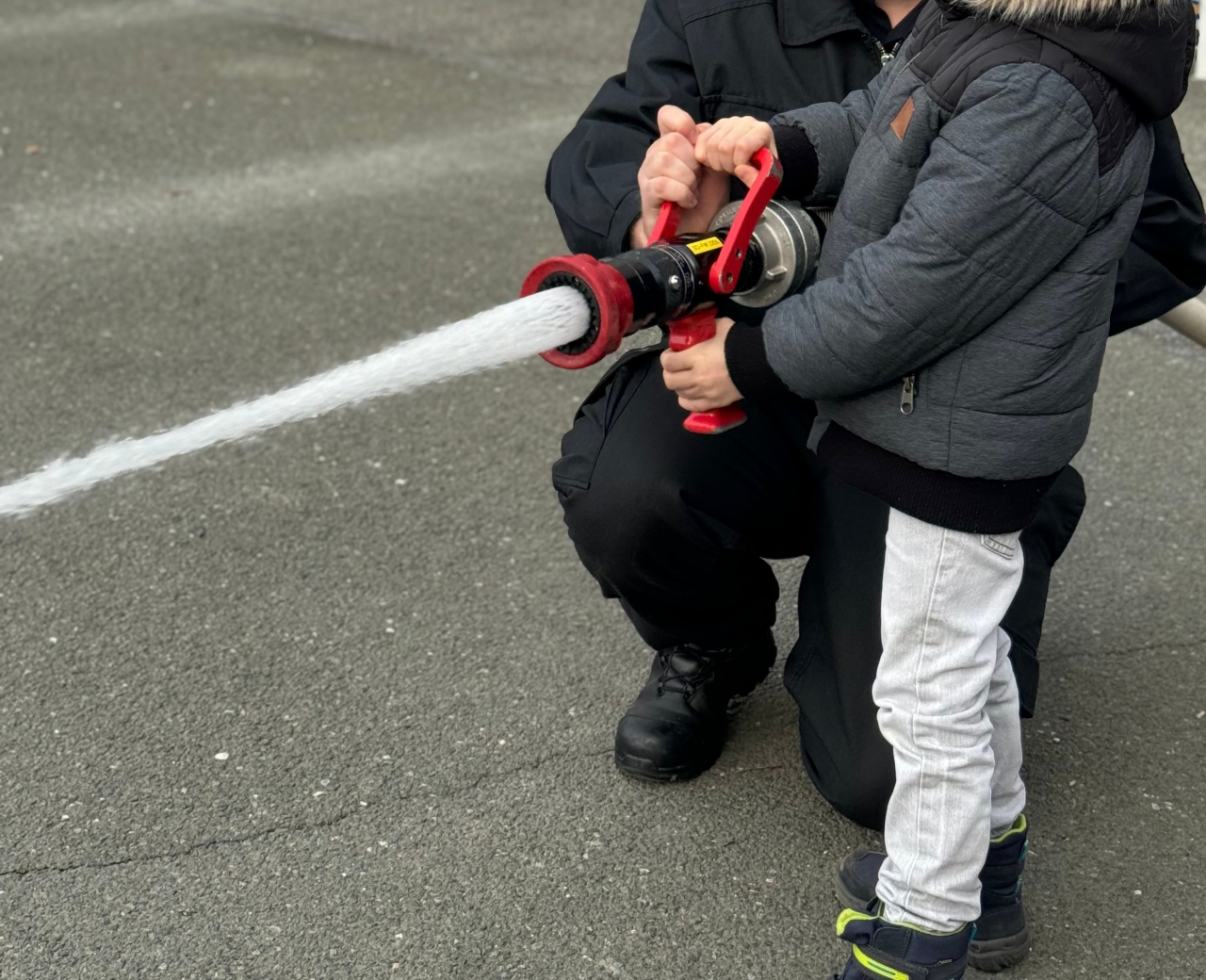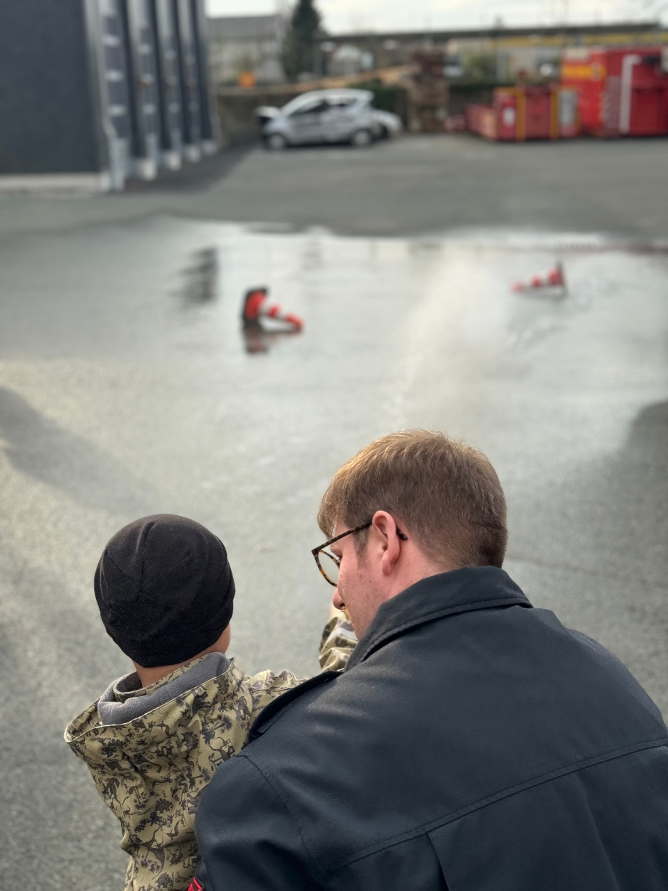 Nun durften die Kinder einmal selbst in die Rolle einer/eines Feuerwehrfrau/mannes schlüpfen und mit einem Strahlrohr „löschen“. Als kleine Aufgabe mussten die Kinder versuchen, zwei Verkehrsleitkegel („Pylone“) mit dem Wasserstrahl umzuschießen und alle hatten dabei mächtig Spaß.