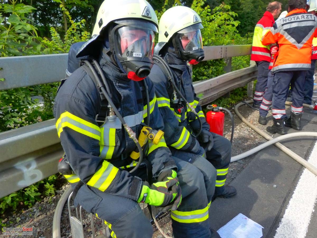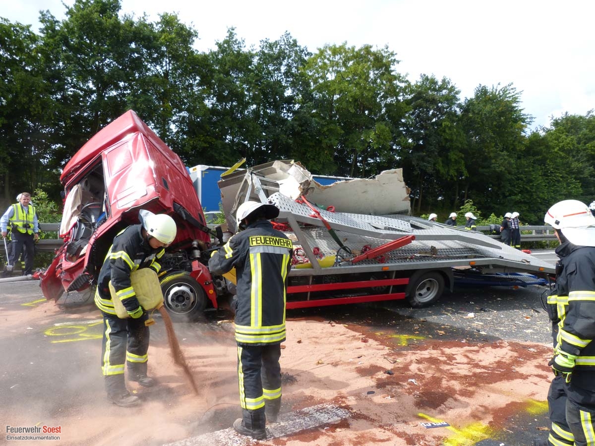 Ei LKW war auf ein auf dem Seitenstreifen stehendes Arbeitsfahrzeug aufgefahren. Infolge dessen ereigneten sich weitere kleinere Unfälle mit mehreren PKW und LKW.