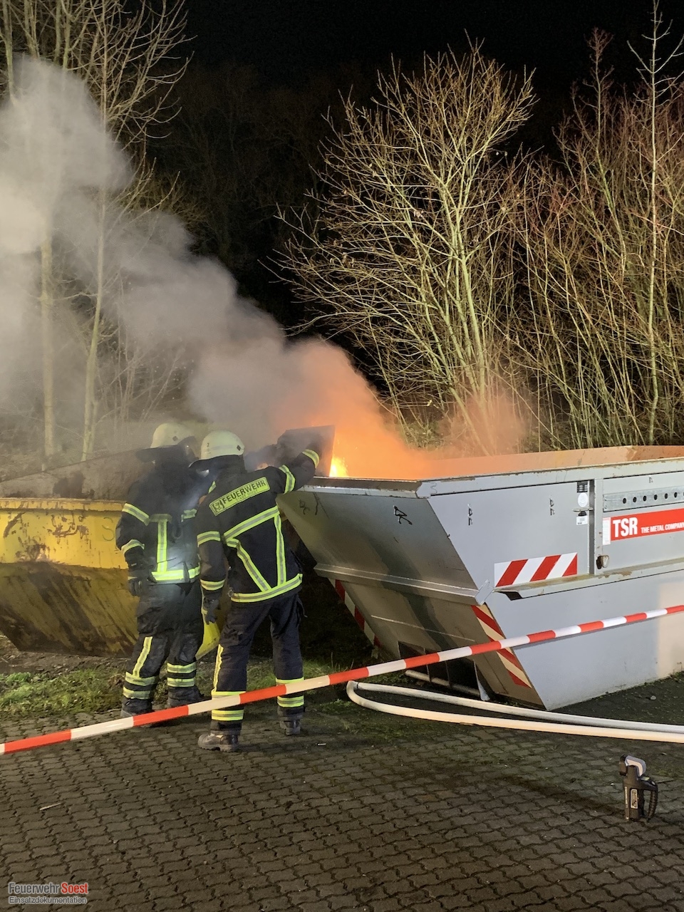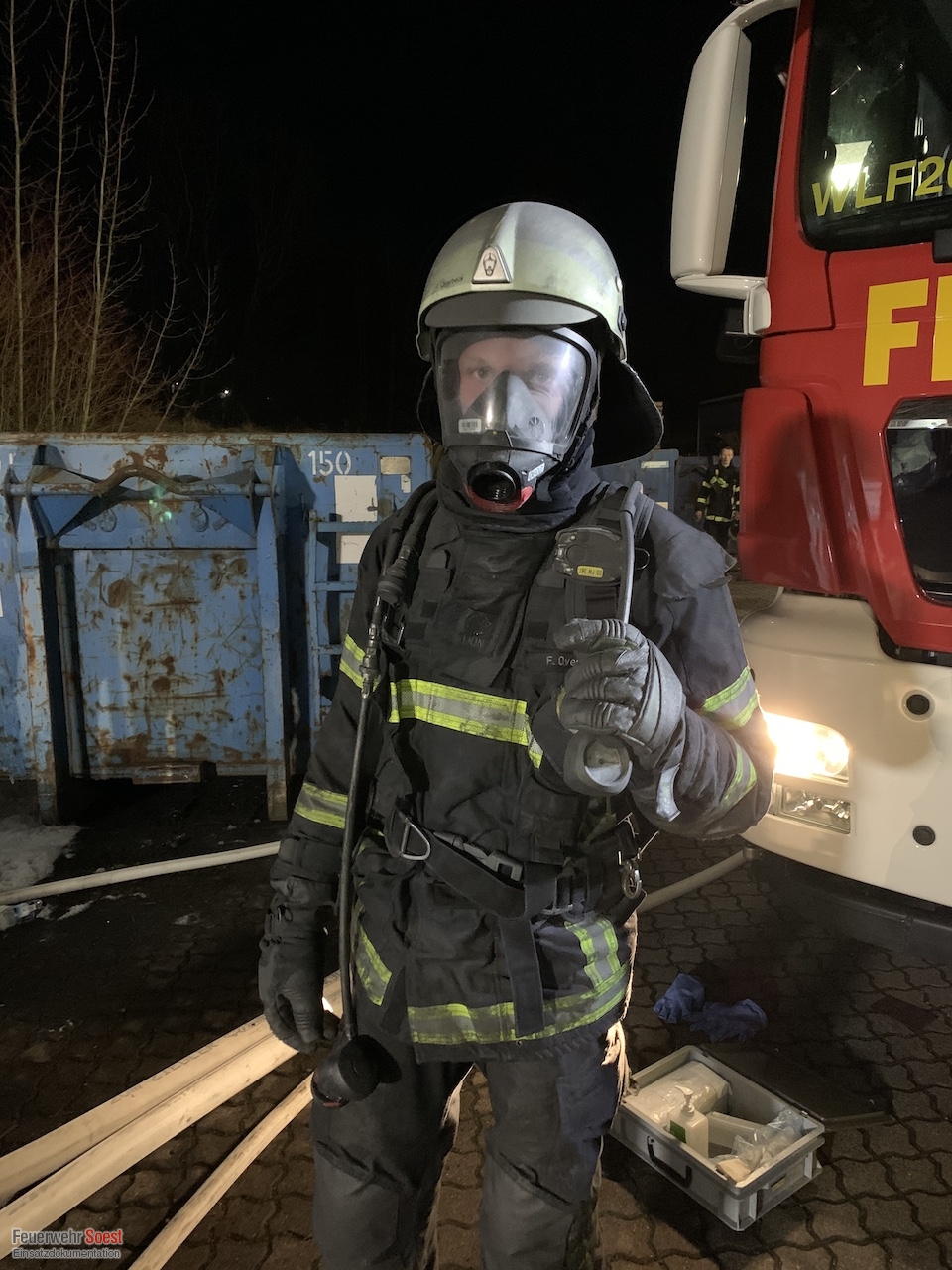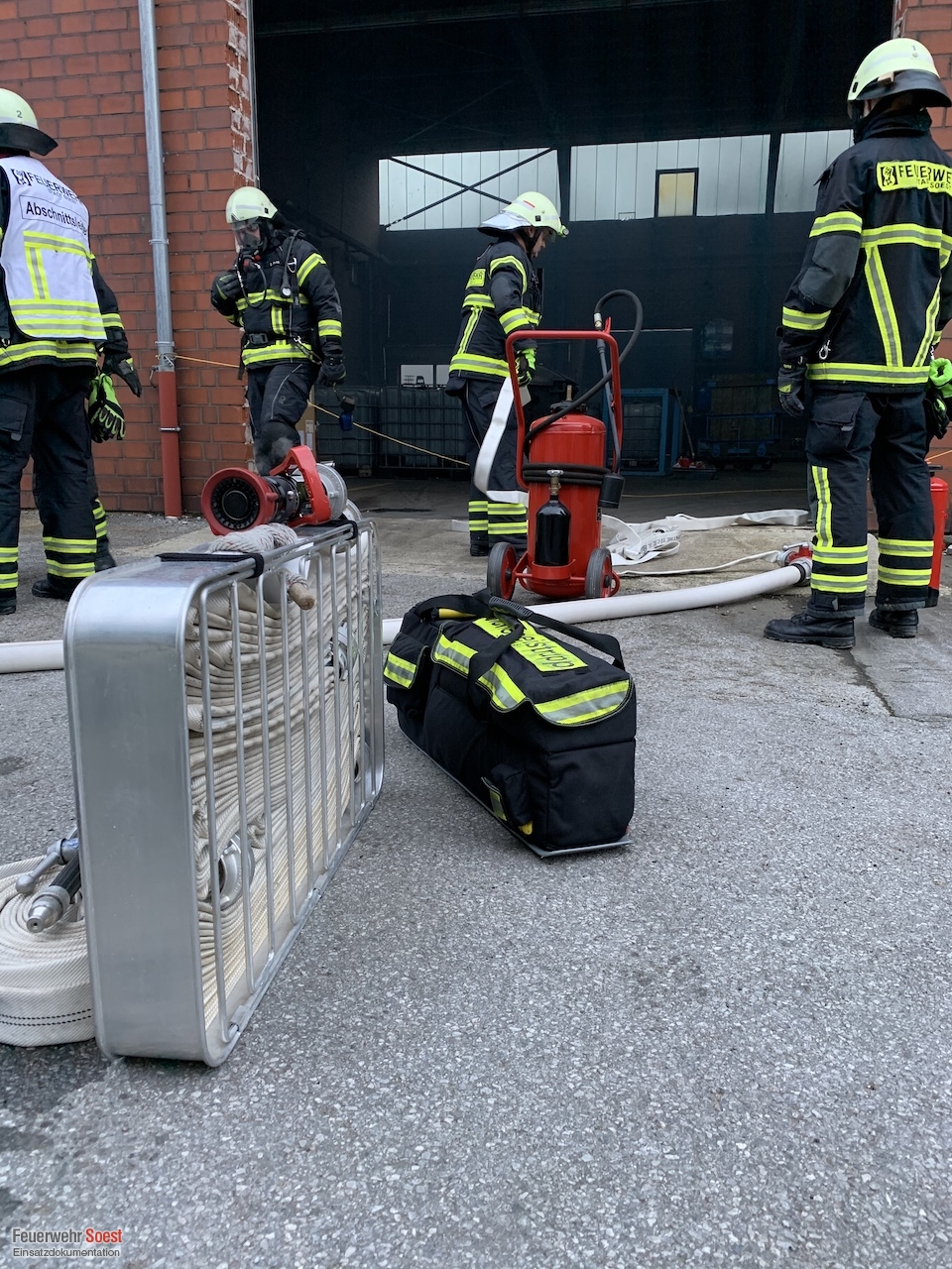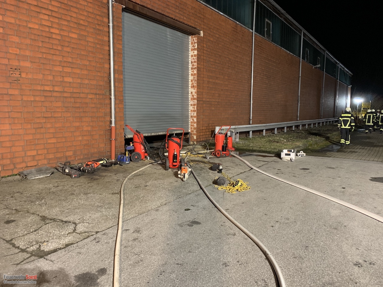 Zum Ablöschen der Metallspäne wurde sehr viel von dem Sonderlöschmittel "Metallbrandpulver" benötigt. Hier bekam die Feuerwehr Soest Unterstützung durch die Feuerwehr Lippstadt. Diese brachten ihr vorhandenes Sonderlöschmittel zur Einsatzstelle.