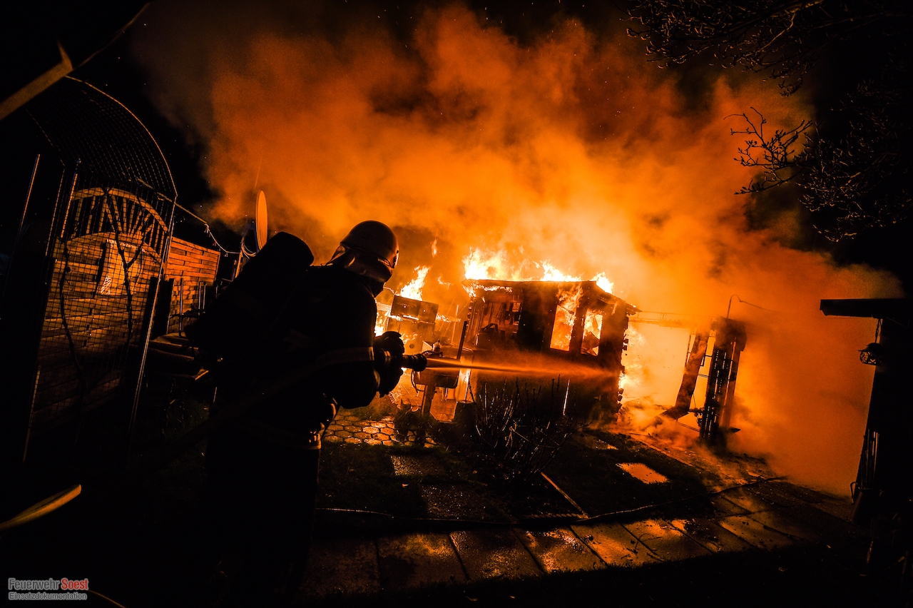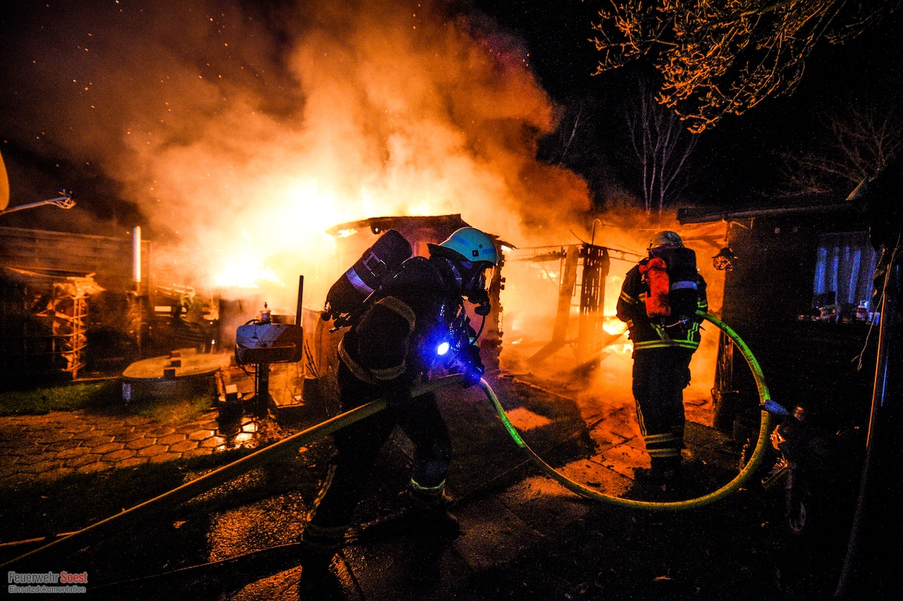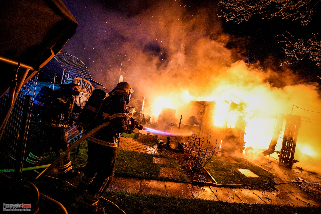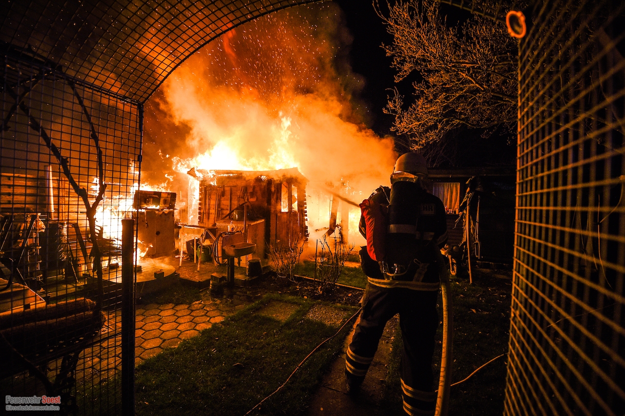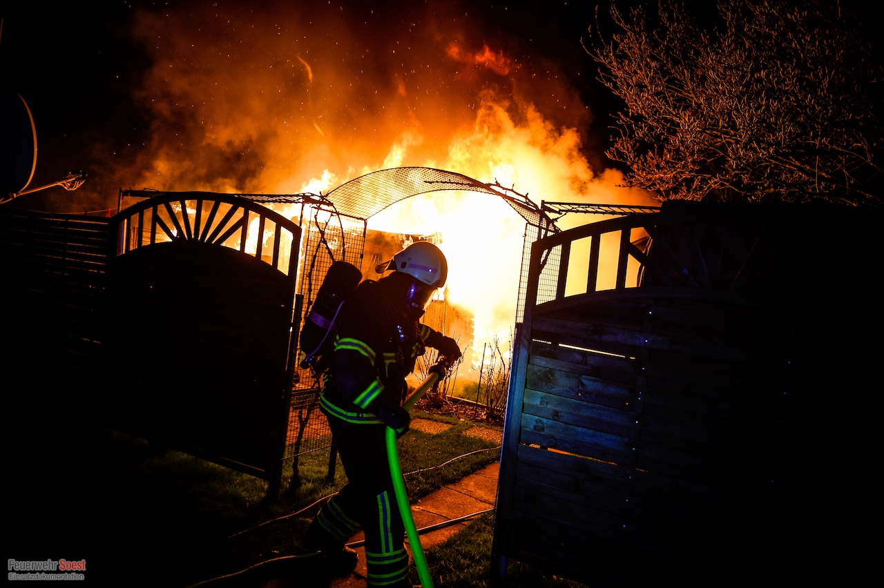 Um 22.26 Uhr wurde die erste Gruppe der Feuerwehr Soest zur Kleingartenanlage am Sassendorfer Weg alarmiert. In den ersten Informationen, die den Einsatzkräften vorlagen, hieß es, dass es einen Brand an einer Laube im Bereich der Schrebergärten gebe. Ein Rettungswagen des Kreises Soest, der als erster vor Ort war, konkretisierte die dramatische Lage: Die Gartenlaube brannte in voller Ausdehnung, meterhohe Flammen schlugen in den Nachthimmel, der starke Wind brachte die Bedrohung mit sich, dass sich das Feuer auf weitere Gartenlauben ausbreiten könnte.