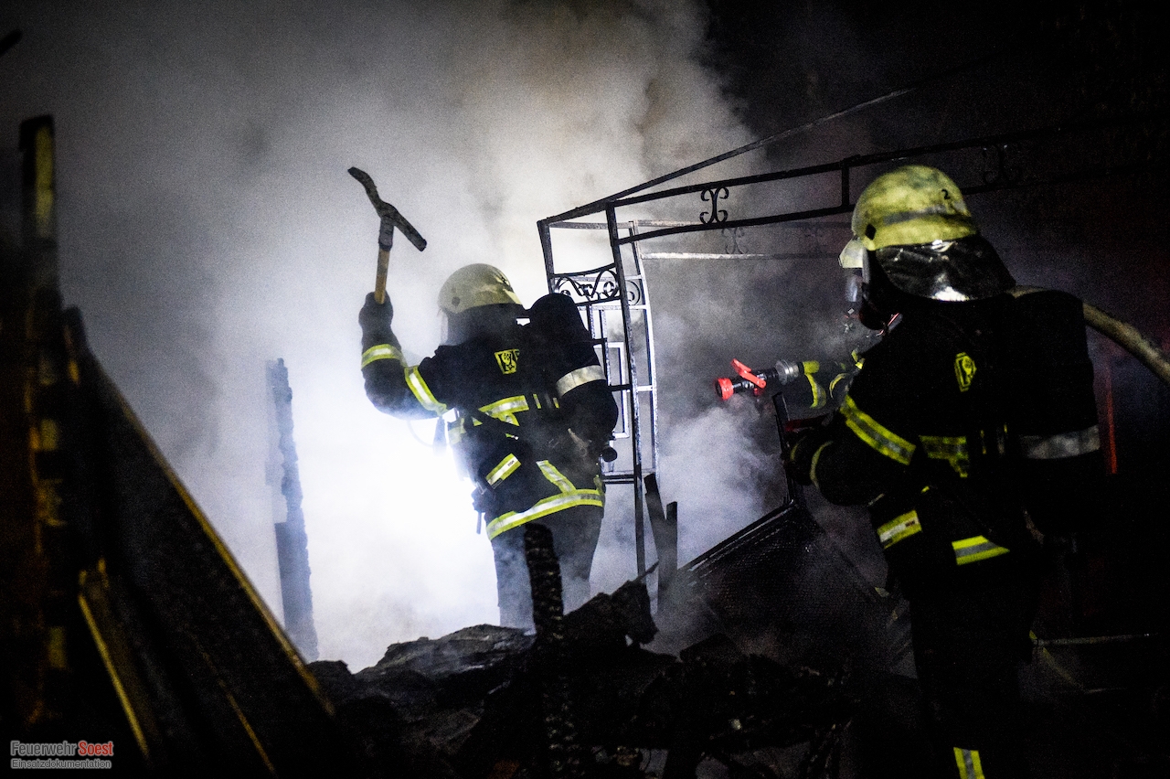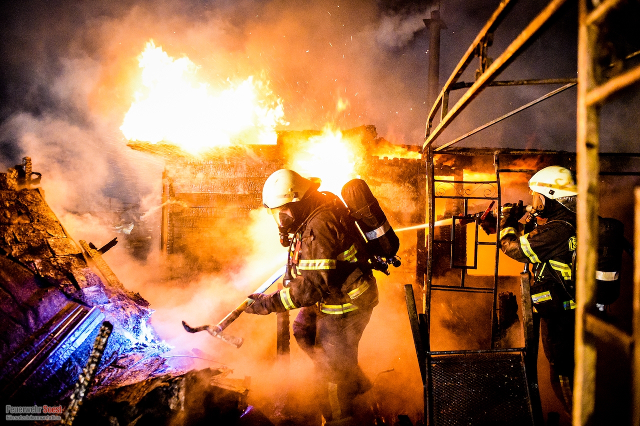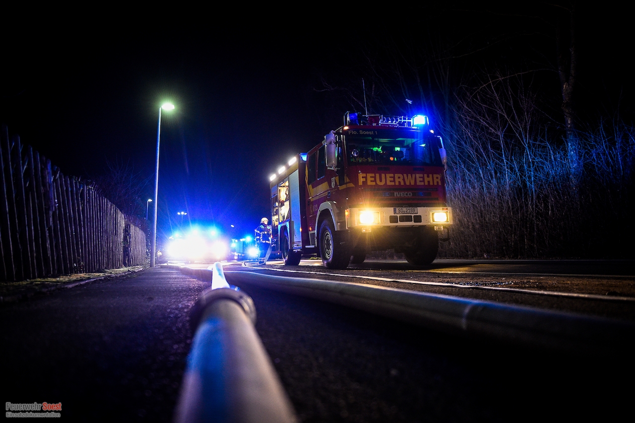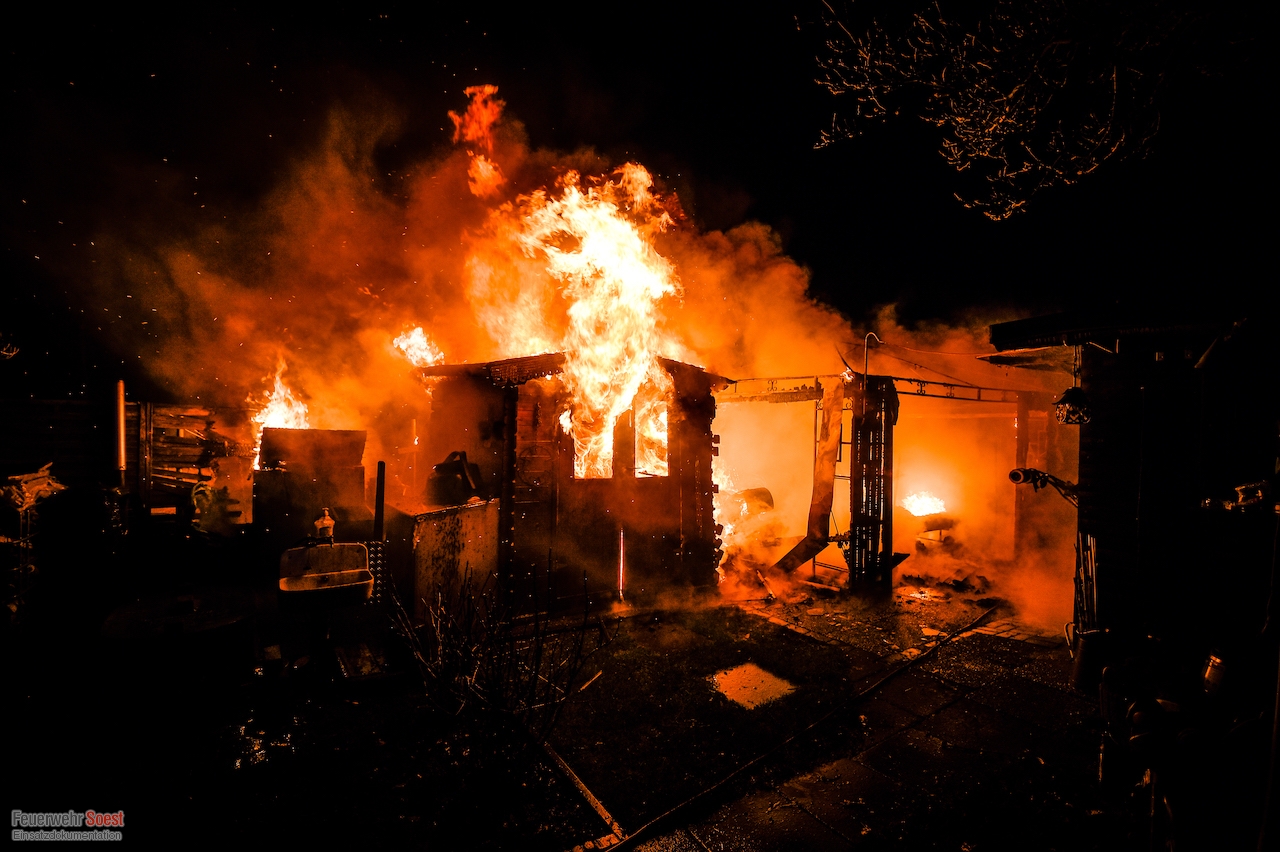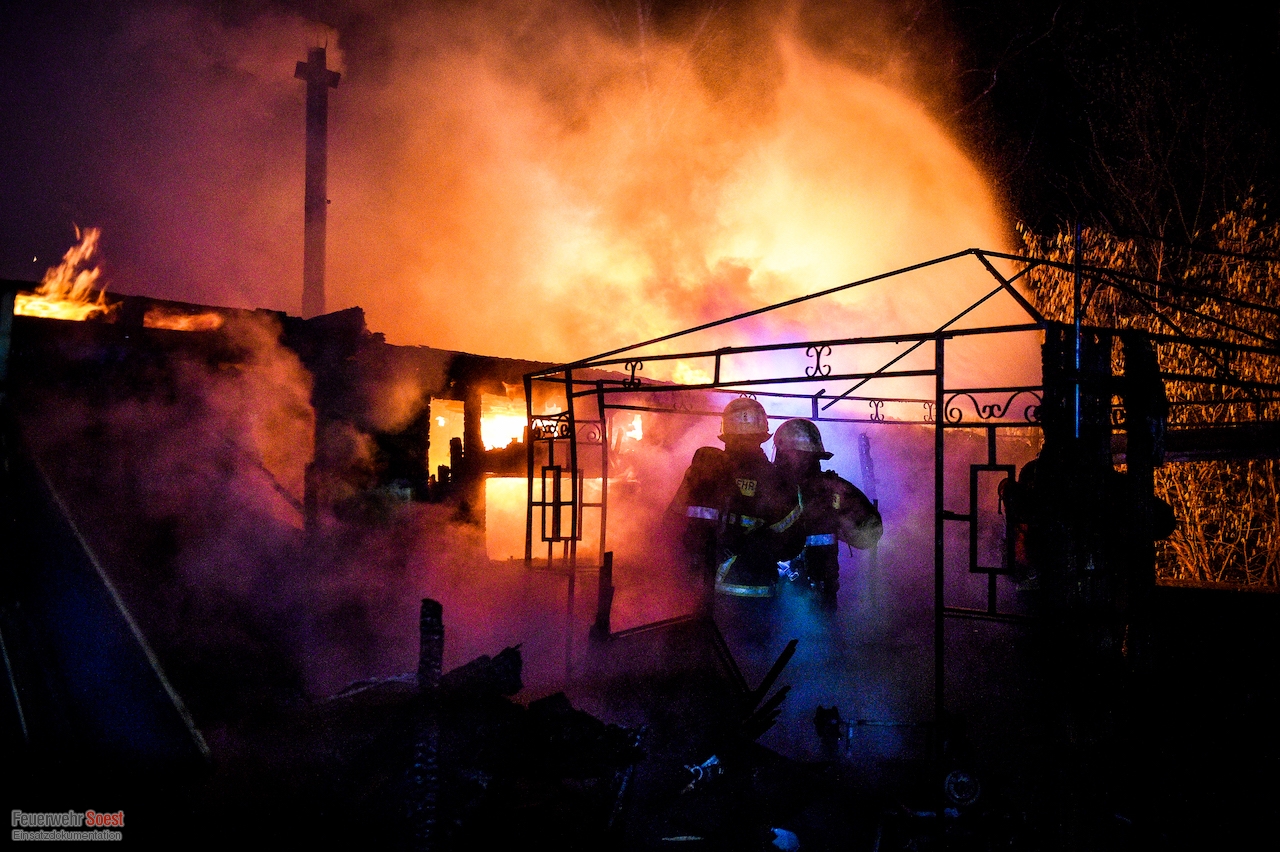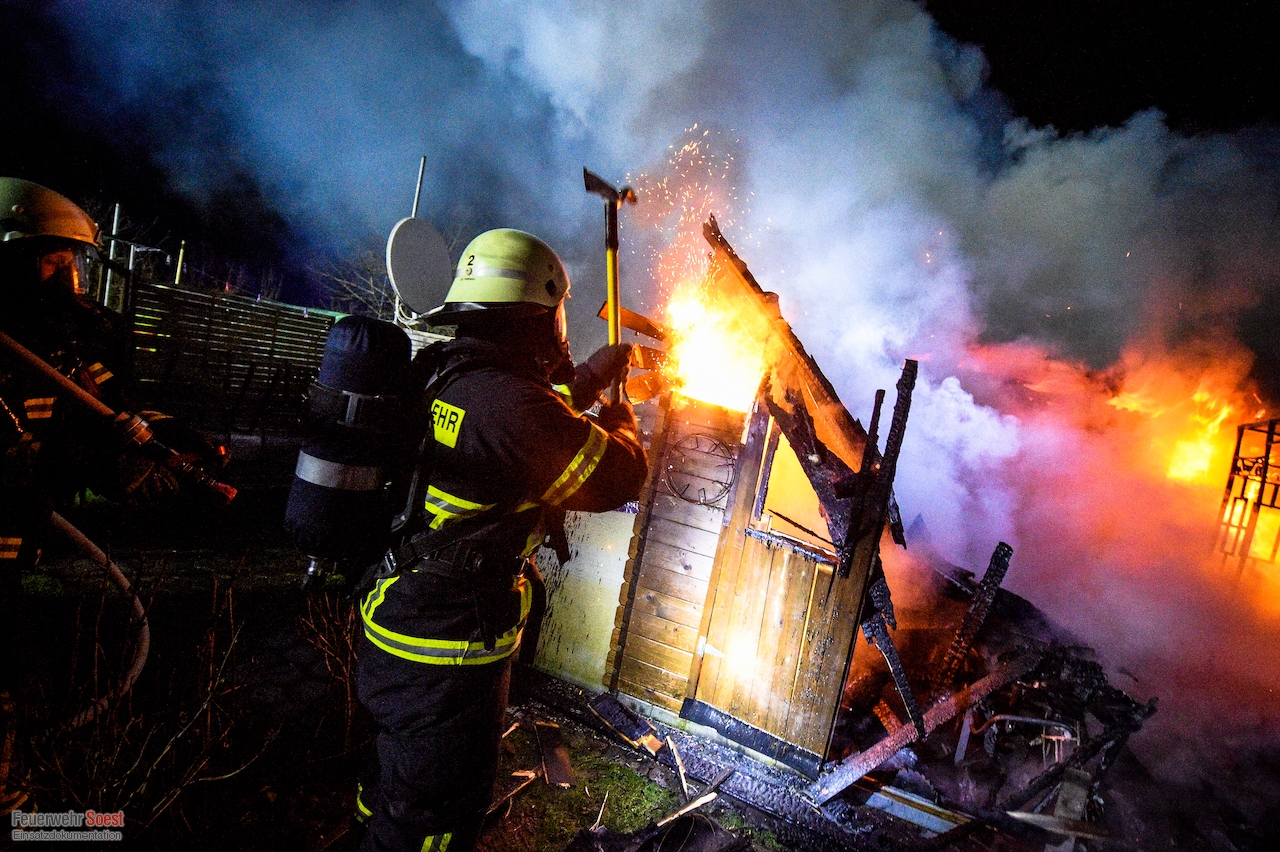 Um 22.26 Uhr wurde die erste Gruppe der Feuerwehr Soest zur Kleingartenanlage am Sassendorfer Weg alarmiert. In den ersten Informationen, die den Einsatzkräften vorlagen, hieß es, dass es einen Brand an einer Laube im Bereich der Schrebergärten gebe. Ein Rettungswagen des Kreises Soest, der als erster vor Ort war, konkretisierte die dramatische Lage: Die Gartenlaube brannte in voller Ausdehnung, meterhohe Flammen schlugen in den Nachthimmel, der starke Wind brachte die Bedrohung mit sich, dass sich das Feuer auf weitere Gartenlauben ausbreiten könnte.