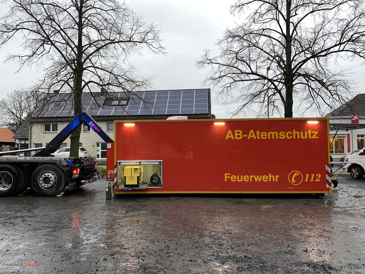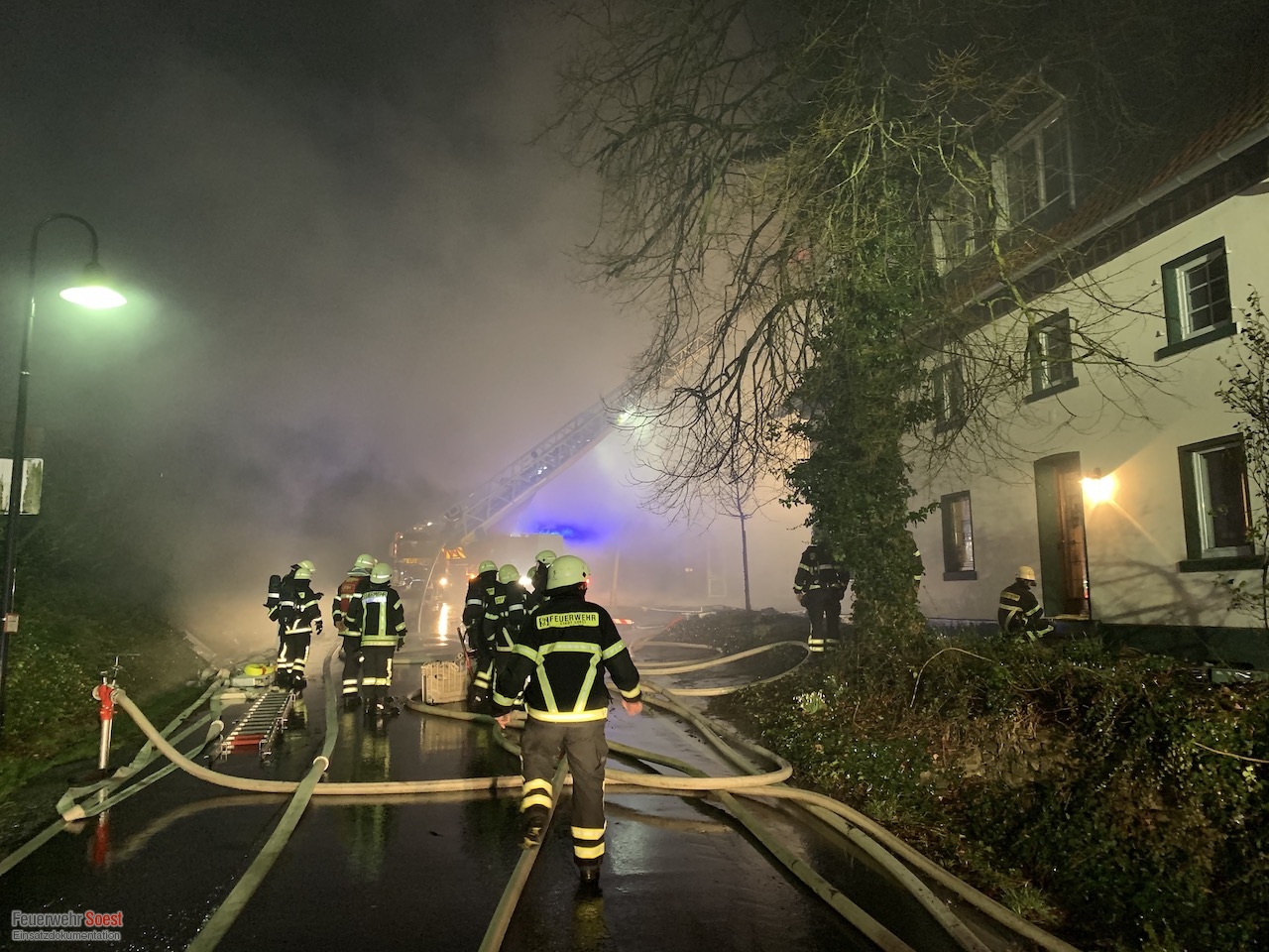 An der Einsatzstelle entstand eine sehr starke Rauchentwicklung, die sich auch sehr bodennah hielt. Daher mussten die meisten Arbeiten an der Scheune unter schwerem Atemschutz durchgeführt werden. Aus diesem Grund wurde der Abrollcontainer Atemschutz des Kreises Soest angefordert. Insgesamt waren ca. 27 Personen unter schwerem Atemschutz im Einsatz. In der Hauptphase wurden ca. 6000 Liter Wasser pro Minute abgegeben.