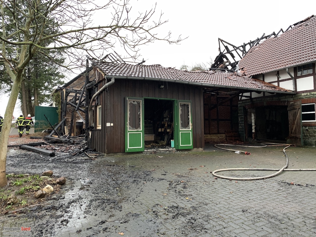Um ein Übergreifen des Feuers auf die angebaute Stallung zu verhindern, wurden zwischenzeitlich 5 C-Rohre, 2 Rohre über die Drehleitern und ein Wasserwerfer von dem Abrollcontainer AB-Wasser/Schaum eingesetzt. Dies zeigte auch den gewünschten Erfolg. Das ehemalige Stallgebäude und das Wohnhaus konnten gehalten werden.