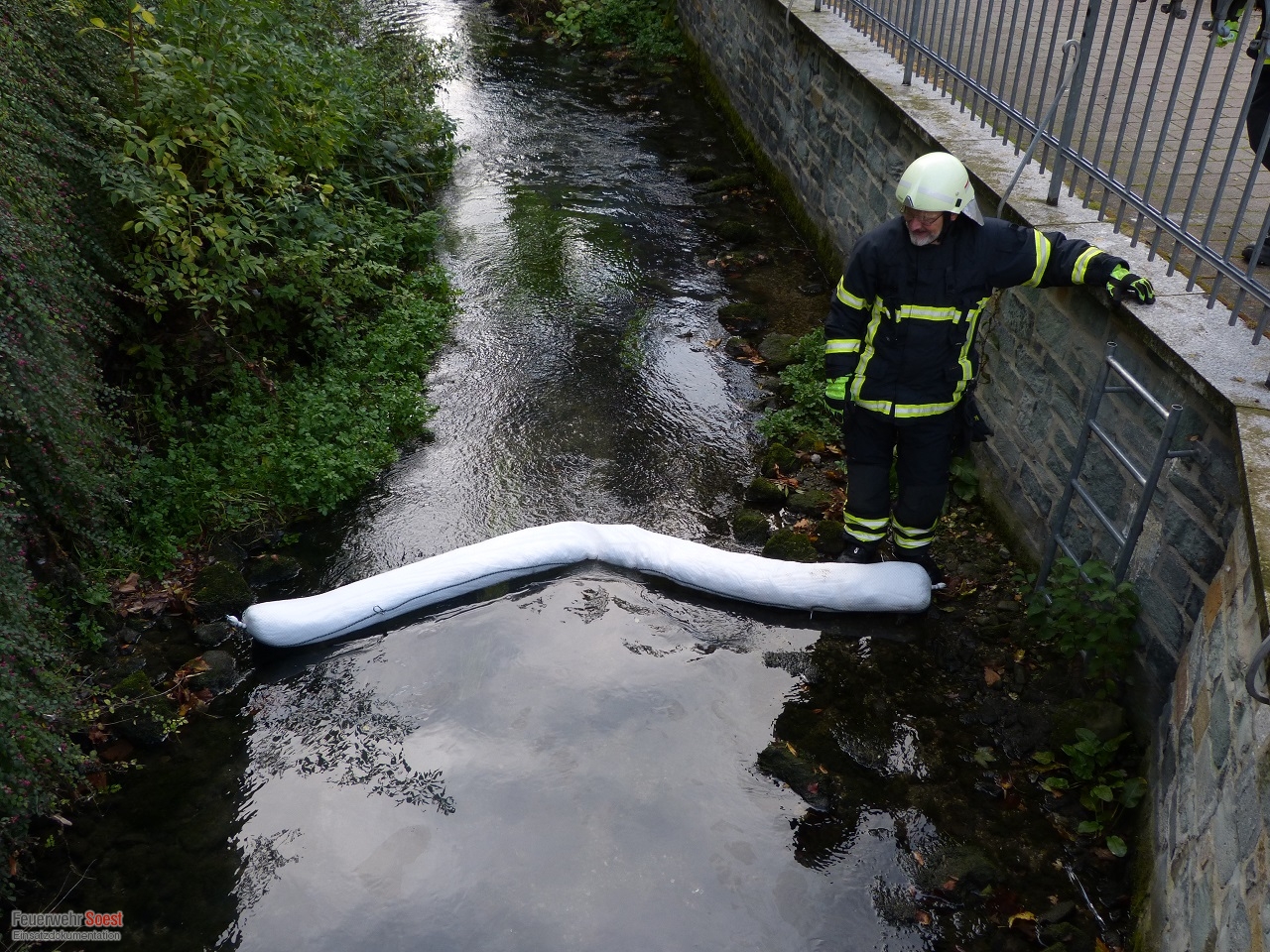 Durch eine Ölspur gelang Öl in den Soestbach. Wir haben die Ölspur abgestreut und Ölsperren im Soestbach ausgelegt.