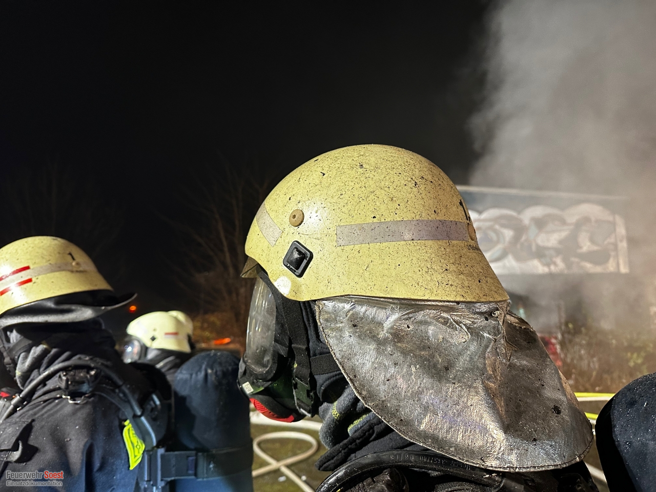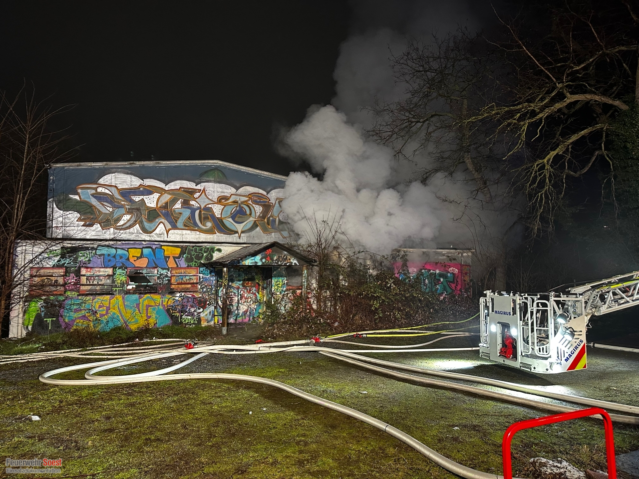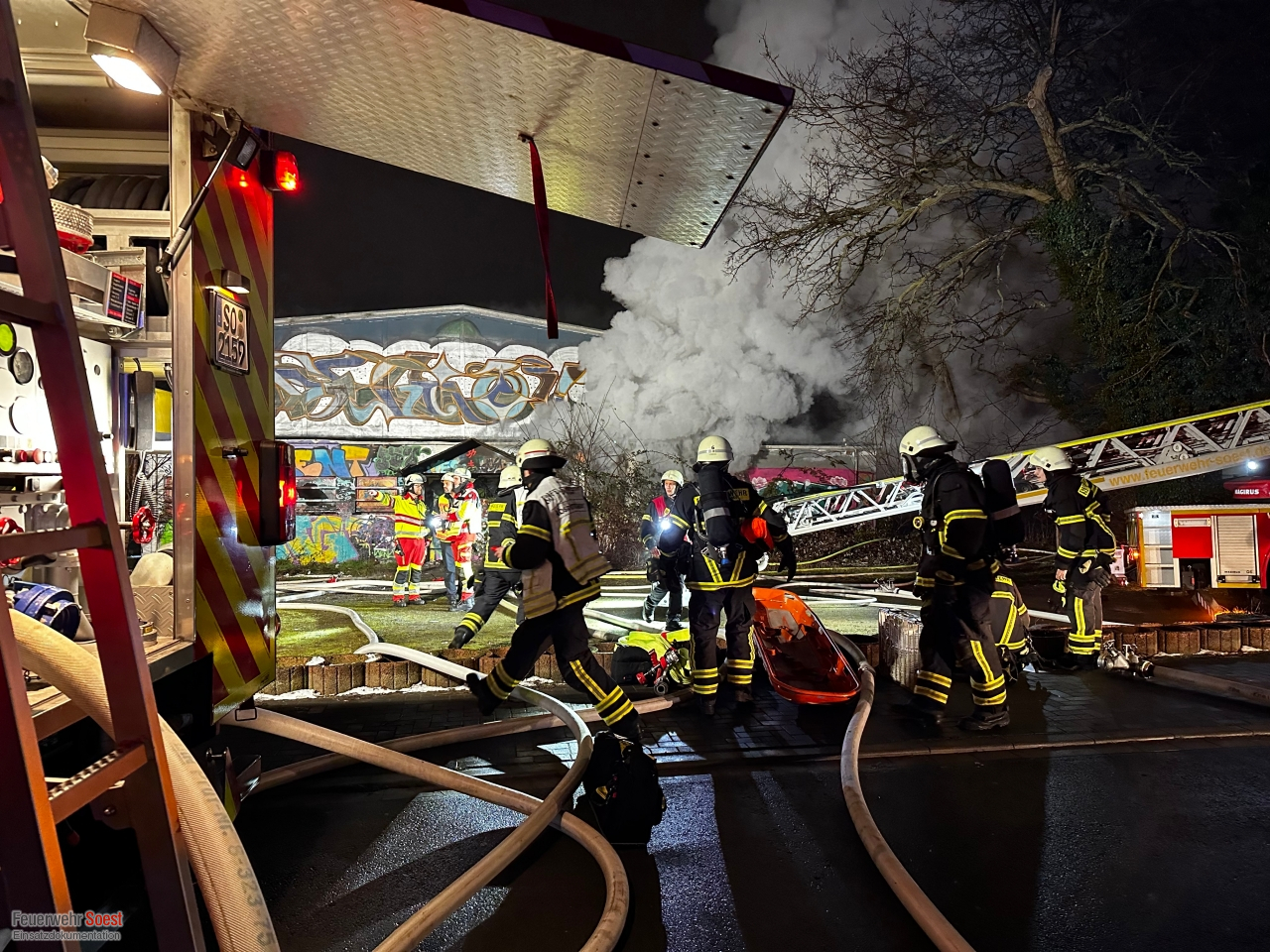 Uns wurde eine starke Rauchentwicklung aus einer leer stehenden Halle gemeldet. Beim Eintreffen unserer ersten Kräfte brannte der Vorraum bereits in voller Ausdehnung. Umgehend wurde eine Brandbekämpfung eingeleitet. Kurz darauf bekamen wir die Information, dass sich unter Umständen noch Personen im Gebäude befinden sollten. Daher wurde eine Menschenrettung eingeleitet. Plötzlich kam es zu Kurzschlüssen an der elektrischen Hauseinspeisung des Gebäudes, sodass sich unsere Kräfte kurzzeitig zurückziehen mussten. Das Gebäude wurde daraufhin durch die Stadtwerke Soest stromlos geschaltet. Glücklicherweise wurden keine Personen im Gebäude gefunden und wir konnten uns auf die Brandbekämpfung konzentrieren.