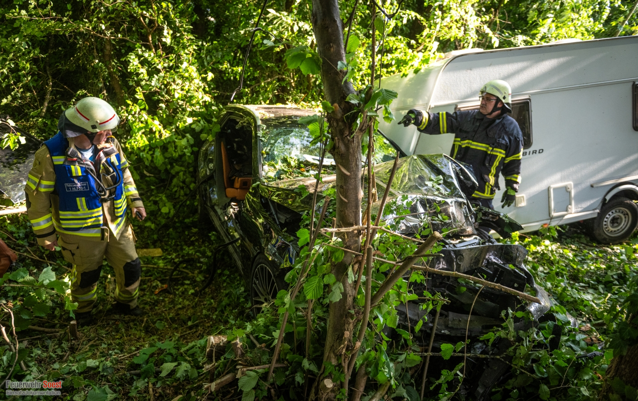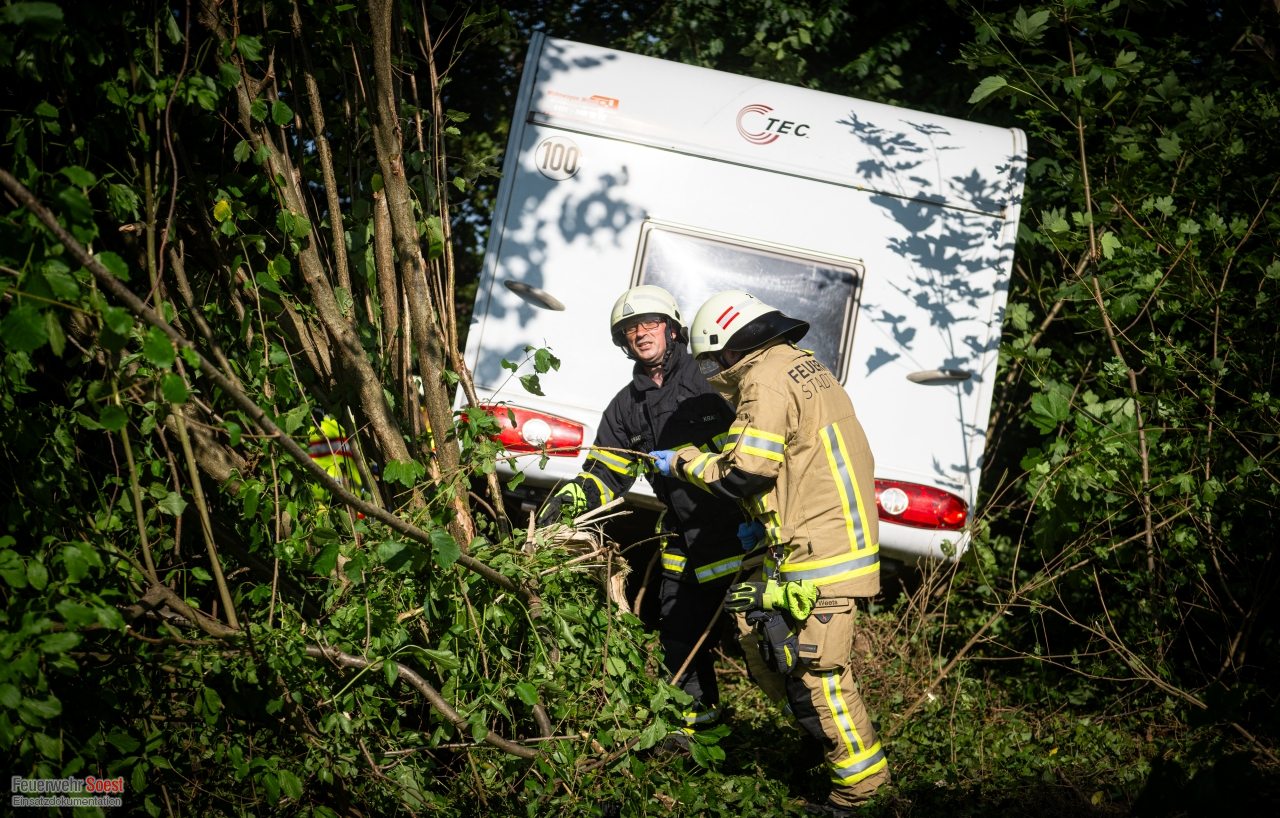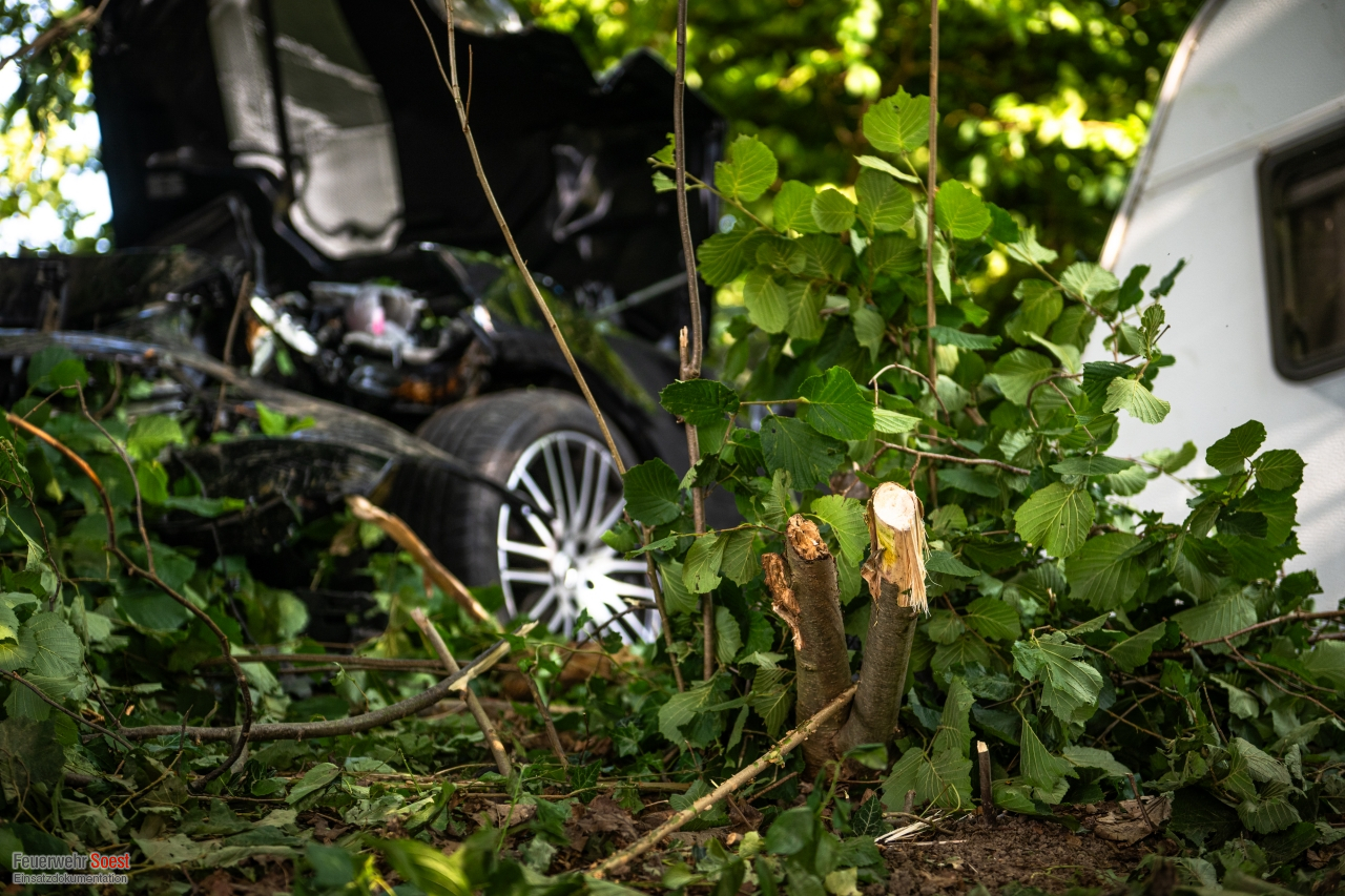 Ein Pkw mit Wohnanhänger fuhr mit hoher Geschwindigkeit über den Rastplatz „Soester Börde“ in Fahrtrichtung Kassel. Am Ende kam das Fahrzeug von der Fahrbahn ab und drang in die angrenzenden Sträucher ein. Im Verlauf des Unfalls drehte sich der Pkw, sodass der Wohnanhänger die Fahrerseite komplett blockierte. Die Beifahrerseite des Pkws war von Bäumen und Büschen vollständig umschlossen. Beide Insassen waren in ihrem Pkw eingeschlossen. Mittels Kettensäge konnten wir die Bäume und Sträucher um den Unfall-PKW herum entfernen, sodass Rettungsdienst und die eingesetzten Feuerwehrkräfte an den Unfallwagen herankamen. Beide Personen waren glücklicherweise nicht in dem Fahrzeug eingeklemmt. Jedoch gestaltet sich die Befreiung etwas aufwändiger. Letztendlich konnten beide Personen über die Beifahrerseite aus dem Pkw gerettet werden und wurden in umliegende Krankenhäuser transportiert.
