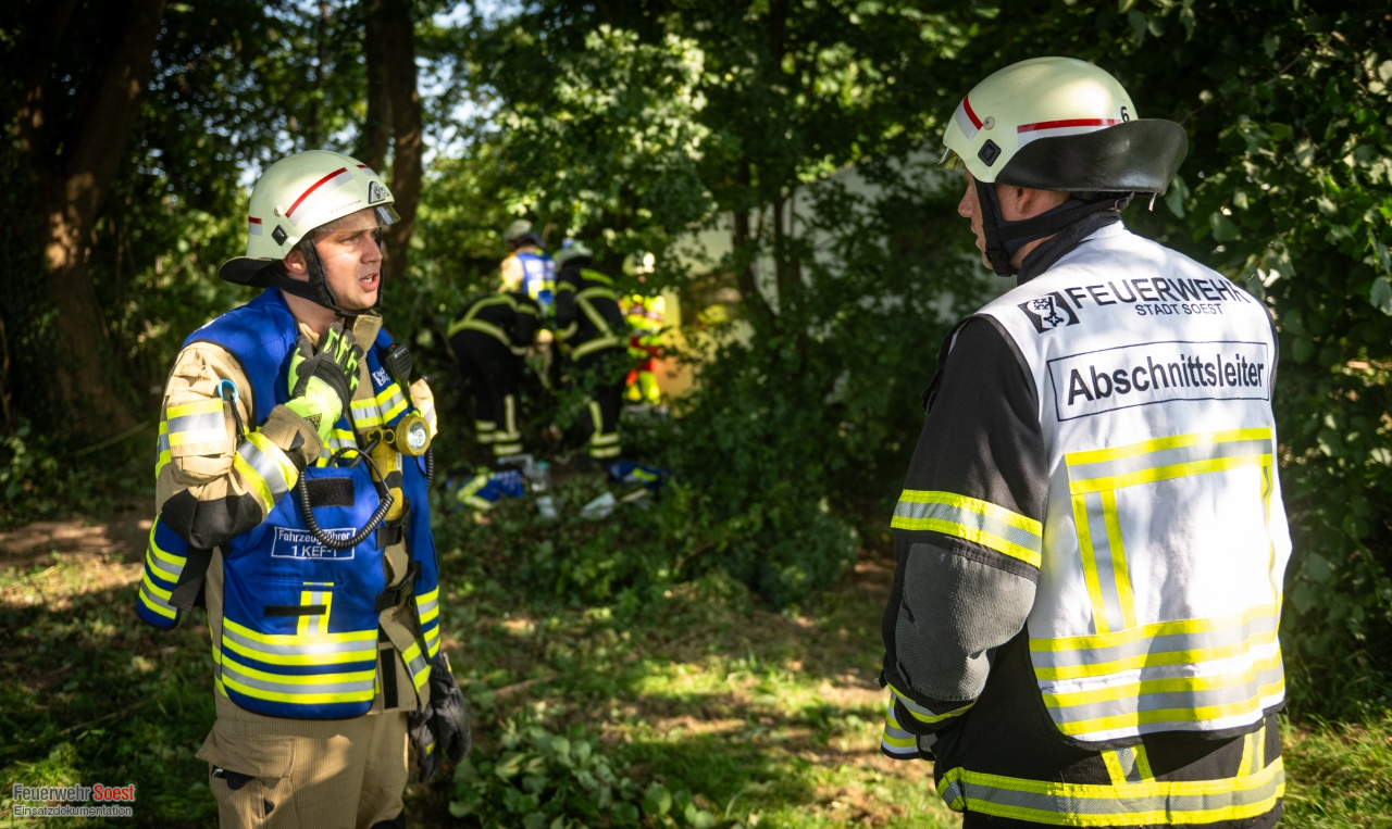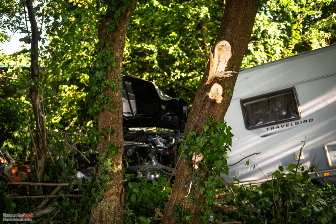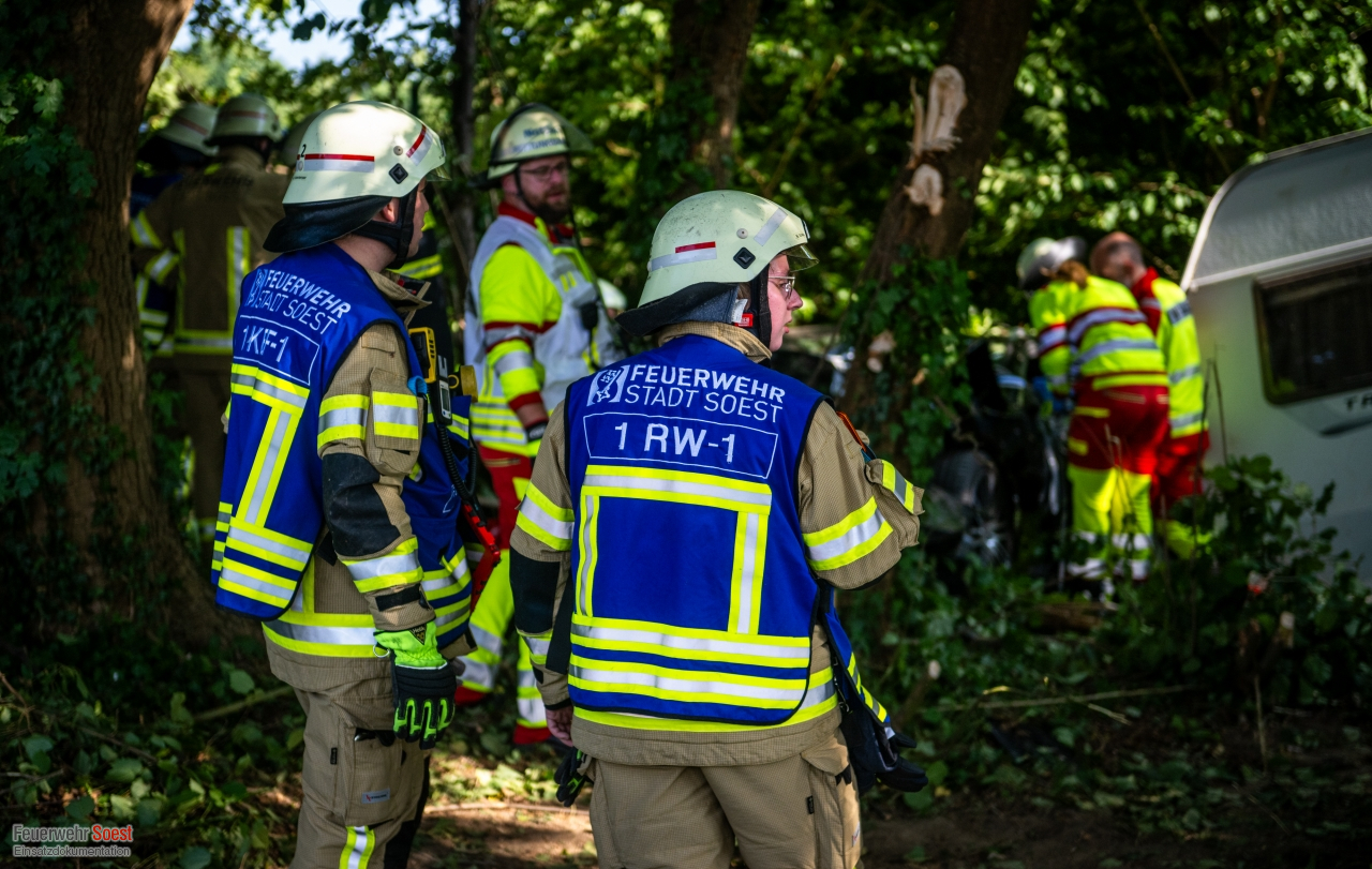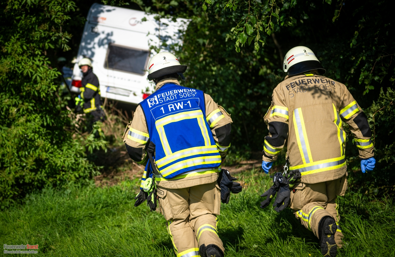 Ein Pkw mit Wohnanhänger fuhr mit hoher Geschwindigkeit über den Rastplatz „Soester Börde“ in Fahrtrichtung Kassel. Am Ende kam das Fahrzeug von der Fahrbahn ab und drang in die angrenzenden Sträucher ein. Im Verlauf des Unfalls drehte sich der Pkw, sodass der Wohnanhänger die Fahrerseite komplett blockierte. Die Beifahrerseite des Pkws war von Bäumen und Büschen vollständig umschlossen. Beide Insassen waren in ihrem Pkw eingeschlossen. Mittels Kettensäge konnten wir die Bäume und Sträucher um den Unfall-PKW herum entfernen, sodass Rettungsdienst und die eingesetzten Feuerwehrkräfte an den Unfallwagen herankamen. Beide Personen waren glücklicherweise nicht in dem Fahrzeug eingeklemmt. Jedoch gestaltet sich die Befreiung etwas aufwändiger. Letztendlich konnten beide Personen über die Beifahrerseite aus dem Pkw gerettet werden und wurden in umliegende Krankenhäuser transportiert.