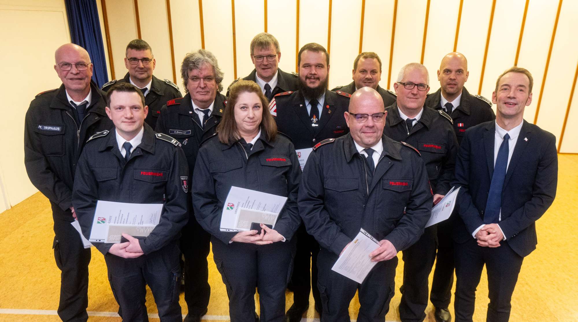 Beförderung zum Oberfeuerwehrmann/-frau: Nils Nethövel, Jan Pape, Florian Hoffmann, Maximilian Wernitz, Cedric-Noel Kroll, Jakob Beetz, Thorsten Hahne, Till Heemann, Joshua Zimmermann, Nikolai Gegeniger-Schmitz, Victoria Bokelmann, Yannick Bokelmann;